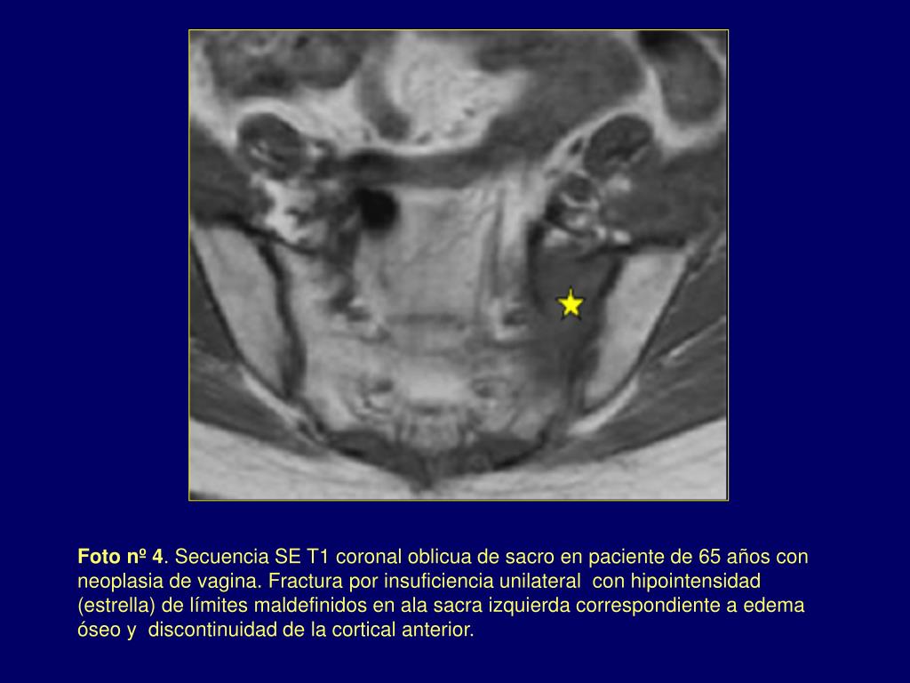 Foto nº 4. Secuencia SE T1 coronal oblicua de sacro en paciente de 65 años con neoplasia de vagina. Fractura por insuficiencia unilateral con hipointensidad (estrella) de límites maldefinidos en ala sacra izquierda correspondiente a edema óseo y discontinuidad de la cortical anterior.