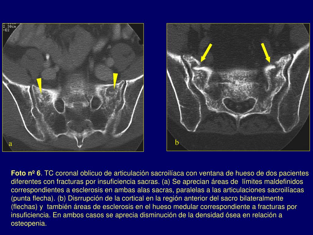 b a Foto nº 6. TC coronal oblicuo de articulación sacroilíaca con ventana de hueso de dos pacientes diferentes con fracturas por insuficiencia sacras. (a) Se aprecian áreas de límites maldefinidos correspondientes a esclerosis en ambas alas sacras, paralelas a las articulaciones sacroilíacas (punta flecha). (b) Disrrupción de la cortical en la región anterior del sacro bilateralmente (flechas) y también áreas de esclerosis en el hueso medular correspondiente a fracturas por insuficiencia. En ambos casos se aprecia disminución de la densidad ósea en relación a osteopenia.