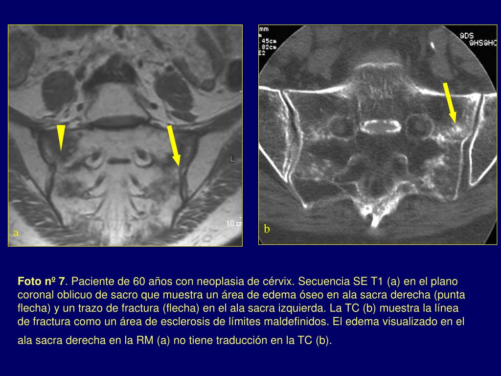 b a Foto nº 7. Paciente de 60 años con neoplasia de cérvix. Secuencia SE T1 (a) en el plano coronal oblicuo de sacro que muestra un área de edema óseo en ala sacra derecha (punta flecha) y un trazo de fractura (flecha) en el ala sacra izquierda. La TC (b) muestra la línea de fractura como un área de esclerosis de límites maldefinidos. El edema visualizado en el ala sacra derecha en la RM (a) no tiene traducción en la TC (b).