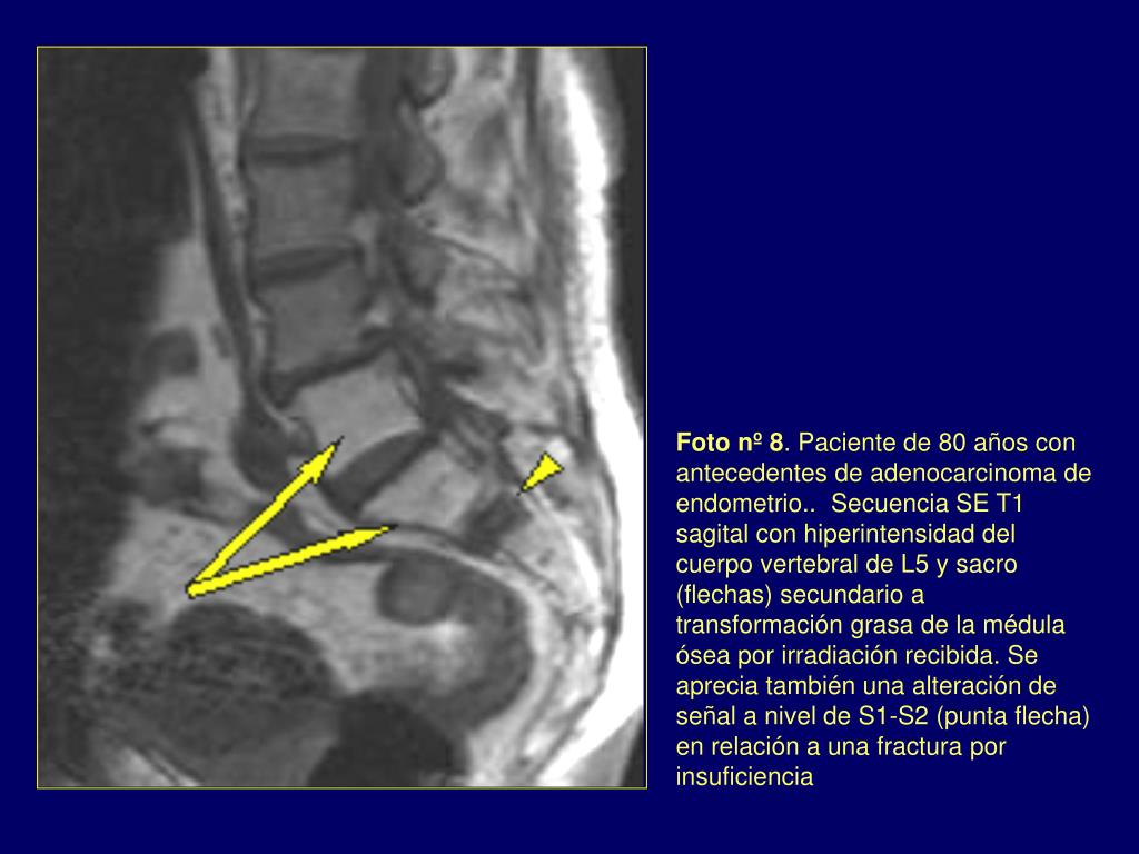 Foto nº 8. Paciente de 80 años con antecedentes de adenocarcinoma de endometrio.. Secuencia SE T1 sagital con hiperintensidad del cuerpo vertebral de L5 y sacro (flechas) secundario a transformación grasa de la médula ósea por irradiación recibida. Se aprecia también una alteración de señal a nivel de S1-S2 (punta flecha) en relación a una fractura por insuficiencia