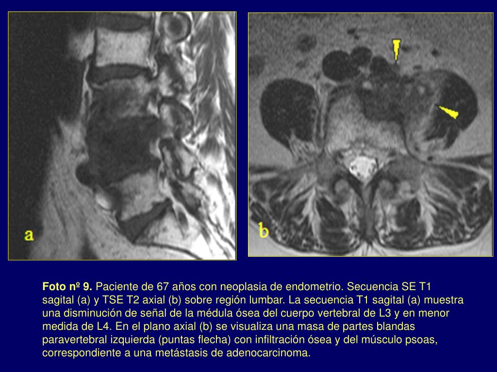 Foto nº 9. Paciente de 67 años con neoplasia de endometrio. Secuencia SE T1 sagital (a) y TSE T2 axial (b) sobre región lumbar. La secuencia T1 sagital (a) muestra una disminución de señal de la médula ósea del cuerpo vertebral de L3 y en menor medida de L4. En el plano axial (b) se visualiza una masa de partes blandas paravertebral izquierda (puntas flecha) con infiltración ósea y del músculo psoas, correspondiente a una metástasis de adenocarcinoma.