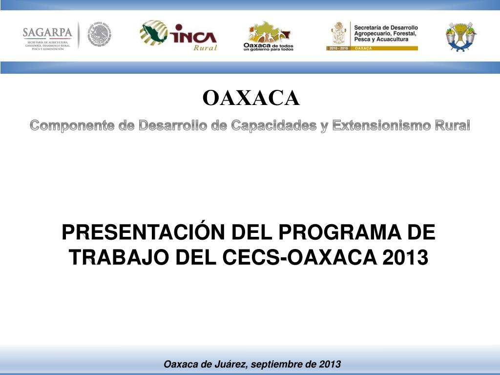 Componente de Desarrollo de Capacidades y Extensionismo Rural PRESENTACIÓN DEL PROGRAMA DE TRABAJO DEL CECS-OAXACA2013 Oaxaca de Juárez, septiembre de 2013