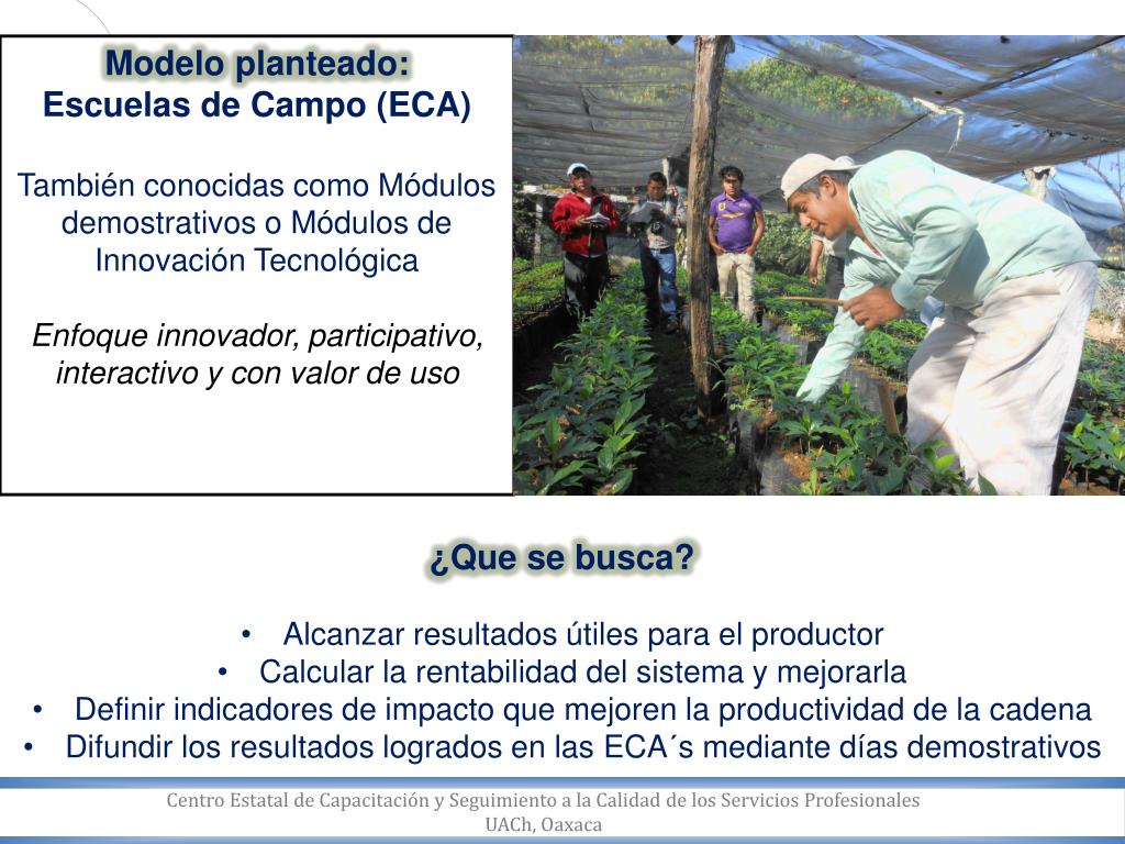 Modelo planteado: Escuelas de Campo (ECA) También conocidas como Módulos demostrativos o Módulos de Innovación Tecnológica Enfoque innovador, participativo, interactivo y con valor de uso ¿Que se busca? Alcanzar resultados útiles para el productor Calcular la rentabilidad del sistema y mejorarla Definir indicadores de impacto que mejoren la productividad de la cadena Difundir los resultados logrados en las ECA´s mediante días demostrativos