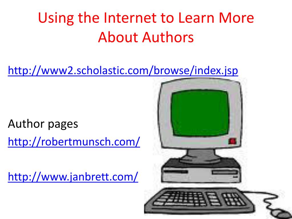 Using the Internet to Learn More About Authors http://www2.scholastic.com/browse/index.jsp Author pages http://robertmunsch.com/ http://www.janbrett.com/