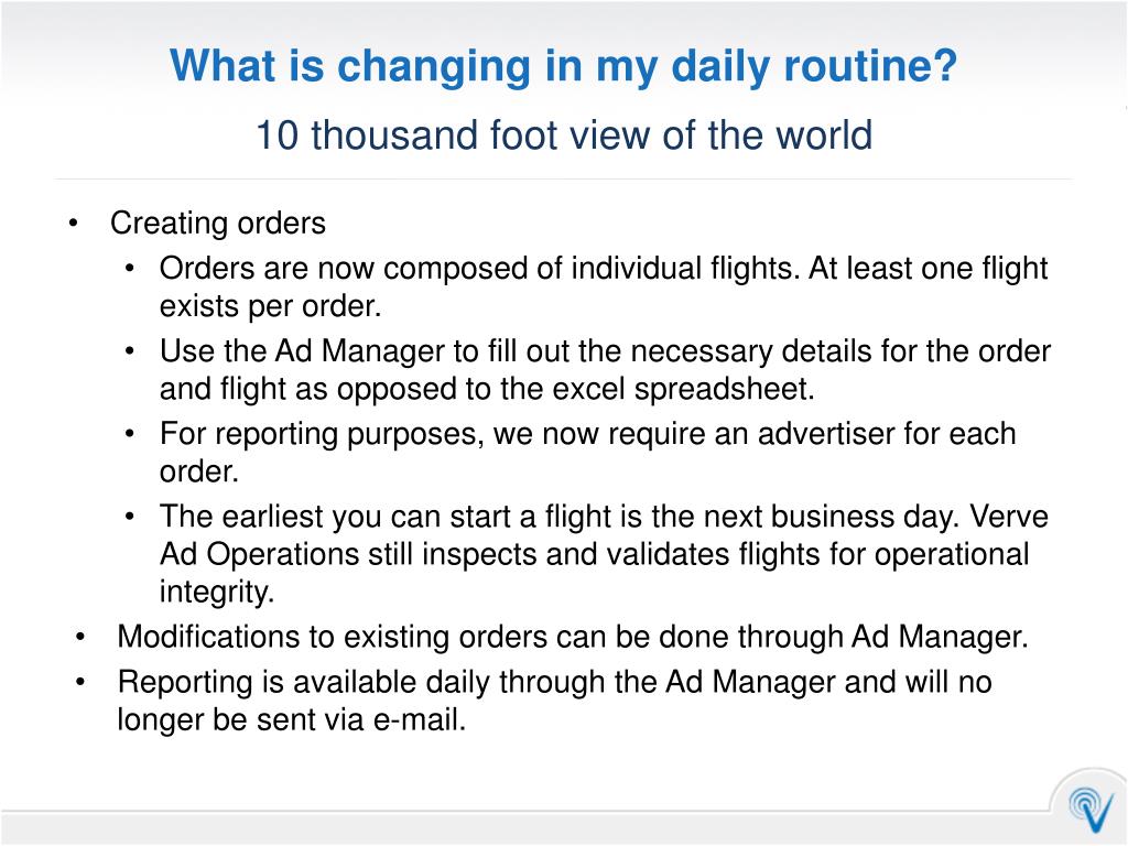What is changing in my daily routine? Creating orders • Orders are now composed of individual flights. At least one flight exists per order. • Use the Ad Manager to fill out the necessary details for the order and flight as opposed to the excel spreadsheet. • For reporting purposes, we now require an advertiser for each order. • The earliest you can start a flight is the next business day. Verve Ad Operations still inspects and validates flights for operational integrity. Modifications to existing orders can be done through Ad Manager. Reporting is available daily through the Ad Manager and will no longer be sent via e-mail. 10 thousand foot view of the world