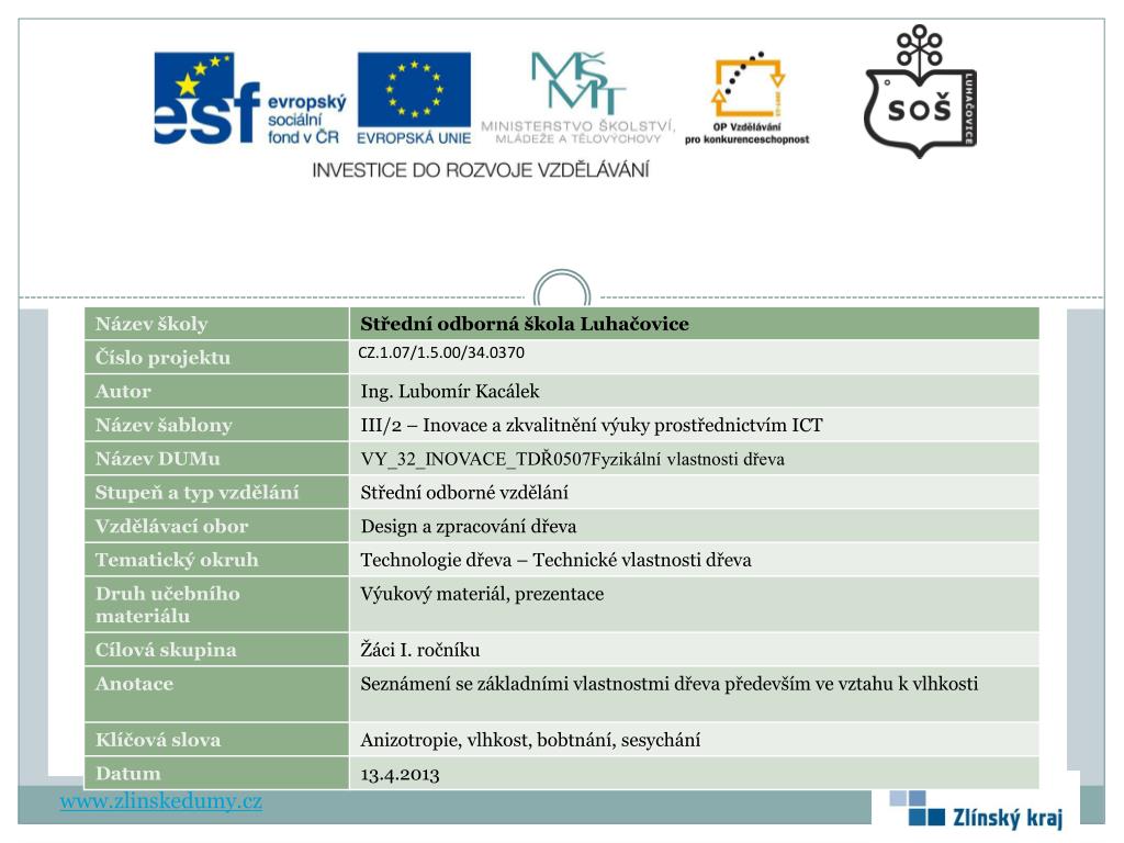 Kontrolní test 1. Je dřevo anizotropní materiál? a) ne b) jen když je suché c) ano vždy 2. Kolik procent vlhkosti má přirozeně vysušené dřevo? a) 15% - 20% b) 5% - 10% c) 25% - 35% 3. K čemu dochází při sesychání dřeva ? a) ke změně barvy dřeva b) k zvětšení objemu a hmotnosti c) ke změně rozměrů a snížení hmotnosti 4. Na co využíváme vztah dřeva k teplu? a) na topení dřevem b) na zlepšení pocitového faktoru c) pro izolační a tepelnou pohodu interiéru 5. Je dřevo vodič? a) ne b) ano c) v určitém stavu je polovodič Odpovědi: 1c, 2 a,3 c,4 c,5a