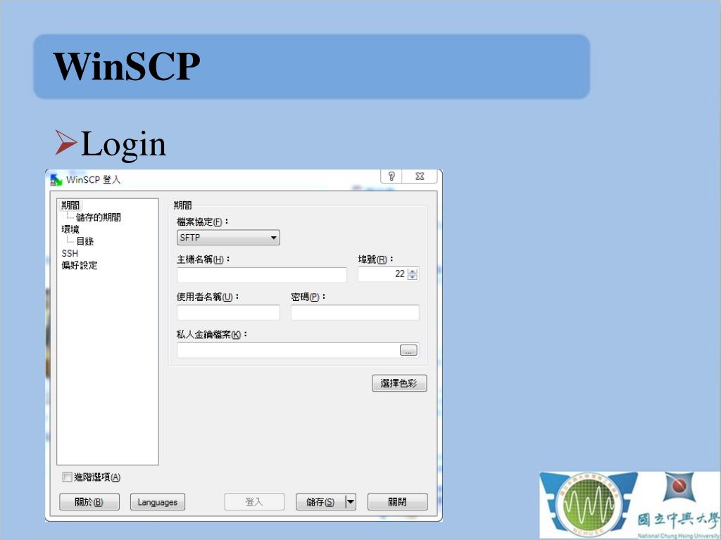 WinSCP • Download it fromhttp://ares.ee.nchu.edu.tw/nslab/winscp.ziphttp://winscp.net/download/winscp513setup.exe