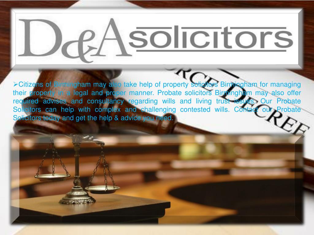 Citizens of Birmingham may also take help of property solicitors Birmingham for managing their property in a legal and proper manner. Probate solicitors Birmingham may also offer required advises and consultancy regarding wills and living trust issues. Our Probate Solicitors can help with complex and challenging contested wills. Contact our Probate Solicitors today and get the help & advice you need.