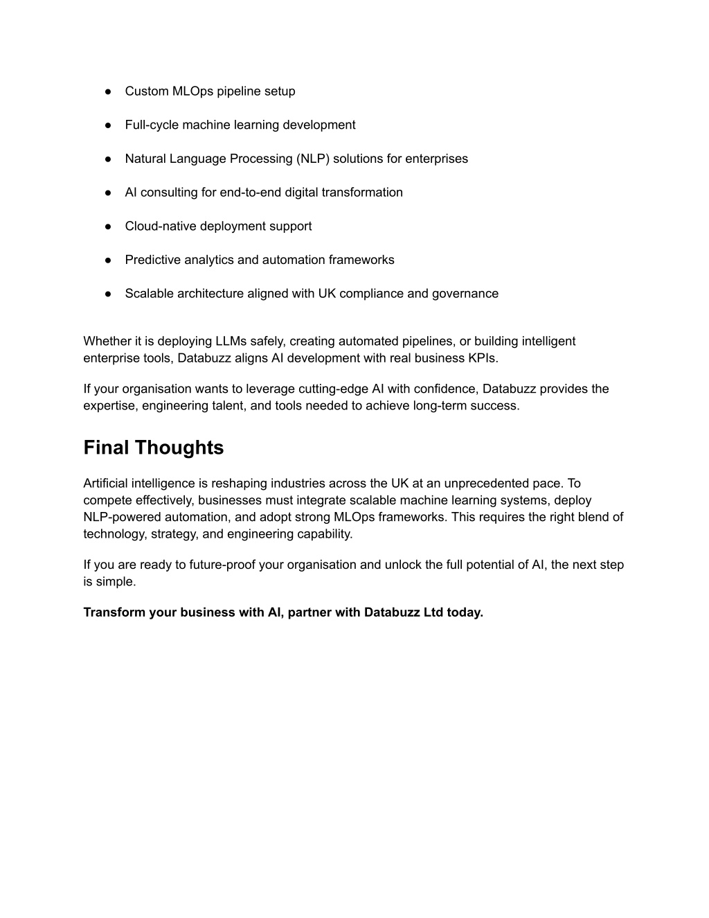 5. ● Custom MLOps pipeline setup ● Full-cycle machine learning development ● Natural Language Processing (NLP) solutions for enterprises ● AI consulting for end-to-end digital transformation ● Cloud-native deployment support ● Predictive analytics and automation frameworks ● Scalable architecture aligned with UK compliance and governance Whether it is deploying LLMs safely, creating automated pipelines, or building intelligent enterprise tools, Databuzz aligns AI development with real business KPIs. If your organisation wants to leverage cutting-edge AI with confidence, Databuzz provides the expertise, engineering talent, and tools needed to achieve long-term success. Final Thoughts Artificial intelligence is reshaping industries across the UK at an unprecedented pace. To compete effectively, businesses must integrate scalable machine learning systems, deploy NLP-powered automation, and adopt strong MLOps frameworks. This requires the right blend of technology, strategy, and engineering capability. If you are ready to future-proof your organisation and unlock the full potential of AI, the next step is simple. Transform your business with AI, partner with Databuzz Ltd today.
