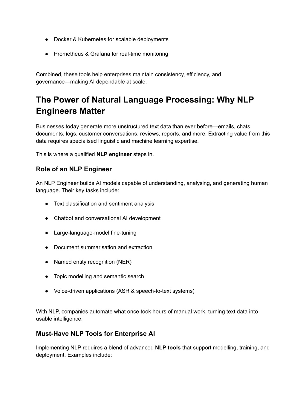 3. ● Docker & Kubernetes for scalable deployments ● Prometheus & Grafana for real-time monitoring Combined, these tools help enterprises maintain consistency, efficiency, and governance—making AI dependable at scale. The Power of Natural Language Processing: Why NLP Engineers Matter Businesses today generate more unstructured text data than ever before—emails, chats, documents, logs, customer conversations, reviews, reports, and more. Extracting value from this data requires specialised linguistic and machine learning expertise. This is where a qualified NLP engineer steps in. Role of an NLP Engineer An NLP Engineer builds AI models capable of understanding, analysing, and generating human language. Their key tasks include: ● Text classification and sentiment analysis ● Chatbot and conversational AI development ● Large-language-model fine-tuning ● Document summarisation and extraction ● Named entity recognition (NER) ● Topic modelling and semantic search ● Voice-driven applications (ASR & speech-to-text systems) With NLP, companies automate what once took hours of manual work, turning text data into usable intelligence. Must-Have NLP Tools for Enterprise AI Implementing NLP requires a blend of advanced NLP tools that support modelling, training, and deployment. Examples include: