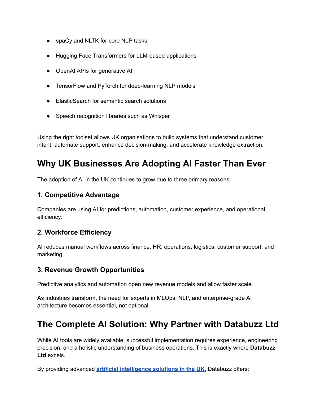 4. ● spaCy and NLTK for core NLP tasks ● Hugging Face Transformers for LLM-based applications ● OpenAI APIs for generative AI ● TensorFlow and PyTorch for deep-learning NLP models ● ElasticSearch for semantic search solutions ● Speech recognition libraries such as Whisper Using the right toolset allows UK organisations to build systems that understand customer intent, automate support, enhance decision-making, and accelerate knowledge extraction. Why UK Businesses Are Adopting AI Faster Than Ever The adoption of AI in the UK continues to grow due to three primary reasons: 1. Competitive Advantage Companies are using AI for predictions, automation, customer experience, and operational efficiency. 2. Workforce Efficiency AI reduces manual workflows across finance, HR, operations, logistics, customer support, and marketing. 3. Revenue Growth Opportunities Predictive analytics and automation open new revenue models and allow faster scale. As industries transform, the need for experts in MLOps, NLP, and enterprise-grade AI architecture becomes essential, not optional. The Complete AI Solution: Why Partner with Databuzz Ltd While AI tools are widely available, successful implementation requires experience, engineering precision, and a holistic understanding of business operations. This is exactly where Databuzz Ltd excels. By providing advanced artificial intelligence solutions in the UK, Databuzz offers:
