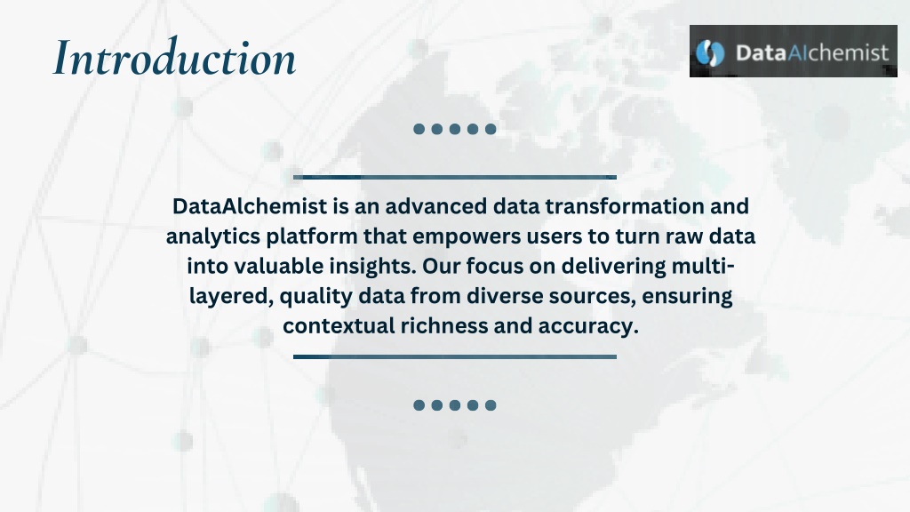 2. Introduction DataAlchemist is an advanced data transformation and analytics platform that empowers users to turn raw data into valuable insights. Our focus on delivering multi- layered, quality data from diverse sources, ensuring contextual richness and accuracy.