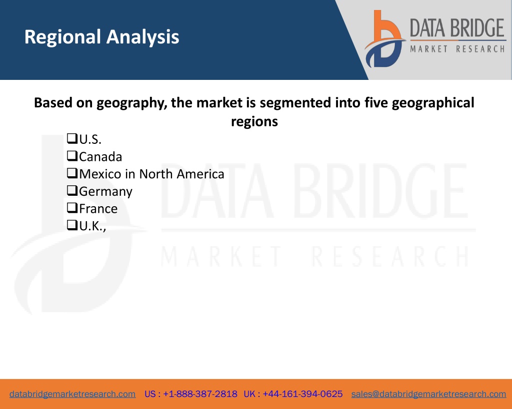 Regional Analysis Based on geography, the market is segmented into five geographical regions U.S. Canada Mexico in North America Germany France U.K., 5 databridgemarketresearch.com US : +1-888-387-2818 UK : +44-161-394-0625 sales@databridgemarketresearch.com