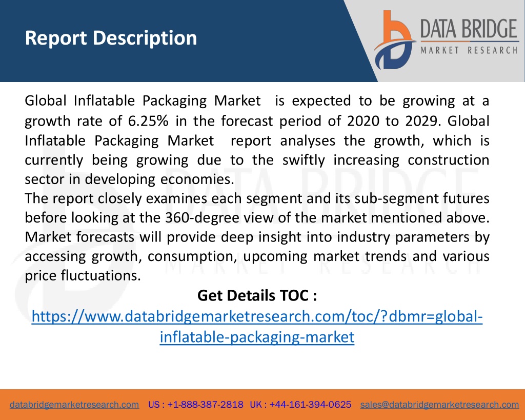 Report Description Global Inflatable Packaging Market is expected to be growing at a growth rate of 6.25% in the forecast period of 2020 to 2029. Global Inflatable Packaging Market report analyses the growth, which is currently being growing due to the swiftly increasing construction sector in developing economies. The report closely examines each segment and its sub-segment futures before looking at the 360-degree view of the market mentioned above. Market forecasts will provide deep insight into industry parameters by accessing growth, consumption, upcoming market trends and various price fluctuations. Get Details TOC : https://www.databridgemarketresearch.com/toc/?dbmr=global- inflatable-packaging-market 2 databridgemarketresearch.com US : +1-888-387-2818 UK : +44-161-394-0625 sales@databridgemarketresearch.com