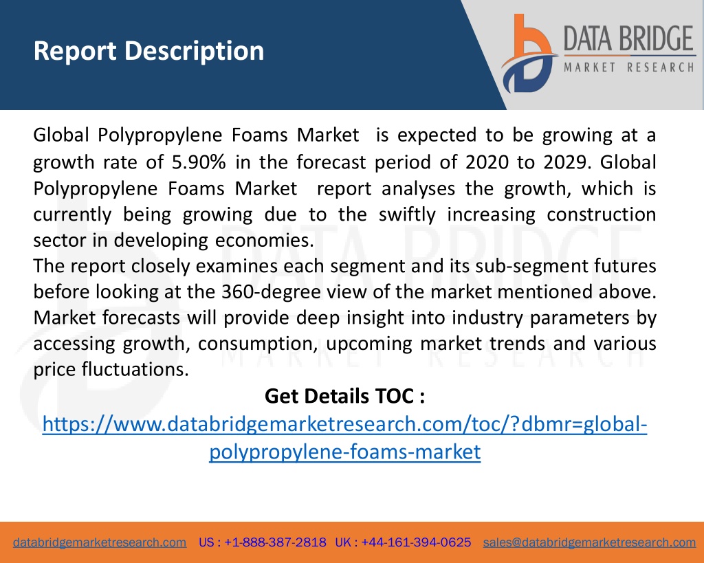 Report Description Global Polypropylene Foams Market is expected to be growing at a growth rate of 5.90% in the forecast period of 2020 to 2029. Global Polypropylene Foams Market report analyses the growth, which is currently being growing due to the swiftly increasing construction sector in developing economies. The report closely examines each segment and its sub-segment futures before looking at the 360-degree view of the market mentioned above. Market forecasts will provide deep insight into industry parameters by accessing growth, consumption, upcoming market trends and various price fluctuations. Get Details TOC : https://www.databridgemarketresearch.com/toc/?dbmr=global- polypropylene-foams-market 2 databridgemarketresearch.com US : +1-888-387-2818 UK : +44-161-394-0625 sales@databridgemarketresearch.com