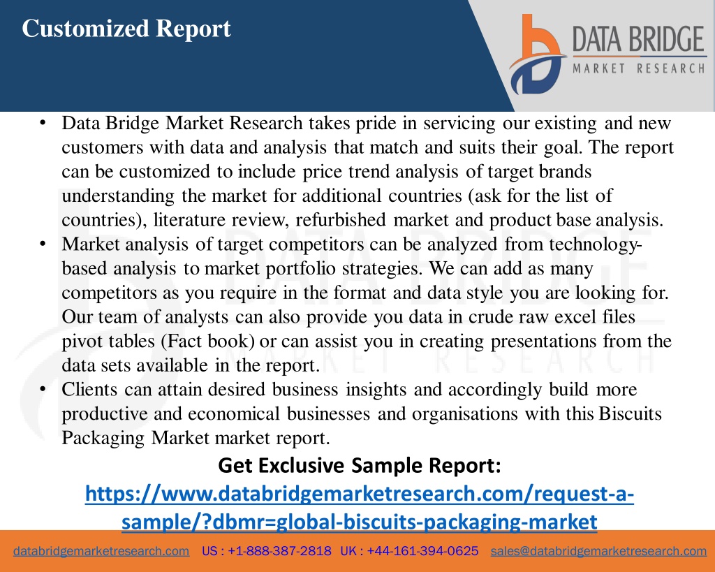 Customized Report • Data Bridge Market Research takes pride in servicing our existing and new customers with data and analysis that match and suits their goal. The report can be customized to include price trend analysis of target brands understanding the market for additional countries (ask for the list of countries), literature review, refurbished market and product base analysis. • Market analysis of target competitors can be analyzed from technology- based analysis to market portfolio strategies. We can add as many competitors as you require in the format and data style you are looking for. Our team of analysts can also provide you data in crude raw excel files pivot tables (Fact book) or can assist you in creating presentations from the data sets available in the report. • Clients can attain desired business insights and accordingly build more productive and economical businesses and organisations with this Biscuits Packaging Market market report. https://www.databridgemarketresearch.com/request-a- sample/?dbmr=global-biscuits-packaging-market Get Exclusive Sample Report: 4 databridgemarketresearch.com US : +1-888-387-2818 UK : +44-161-394-0625 sales@databridgemarketresearch.com