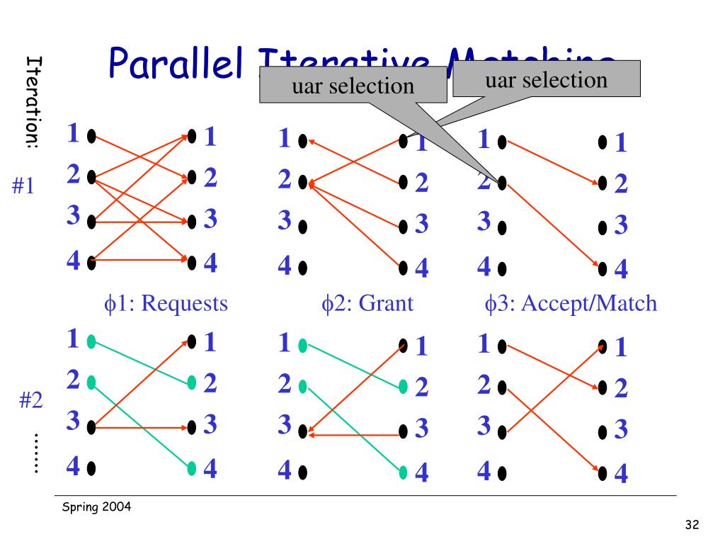 Iteration: 1 1 1 1 2 2 2 2 #1 1 1 3 3 3 3 2 2 4 4 4 4 f2: Grant f3: Accept/Match 3 3 1 1 1 1 1 1 4 4 2 2 2 2 2 2 #2 3 3 3 3 3 3 4 4 4 4 4 4 Parallel Iterative Matching uar selection uar selection f1: Requests