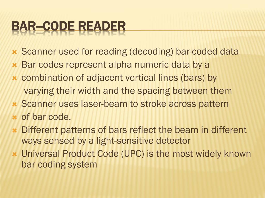 Scanner used for reading (decoding) bar-coded data Bar codes represent alpha numeric data by a combination of adjacent vertical lines (bars) by varying their width and the spacing between them Scanner uses laser-beam to stroke across pattern of bar code. Different patterns of bars reflect the beam in different ways sensed by a light-sensitive detector Universal Product Code (UPC) is the most widely known bar coding system Bar--code Reader