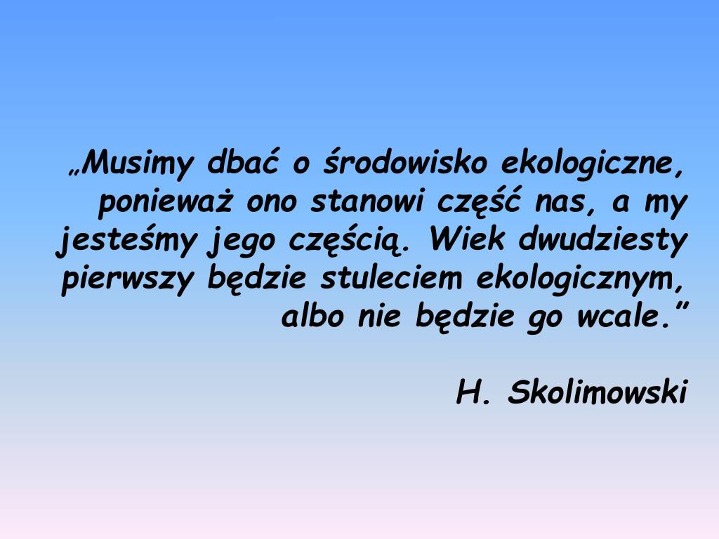 „Musimy dbać o środowisko ekologiczne, ponieważ ono stanowi część nas, a my jesteśmy jego częścią. Wiek dwudziesty pierwszy będzie stuleciem ekologicznym, albo nie będzie go wcale.” H. Skolimowski