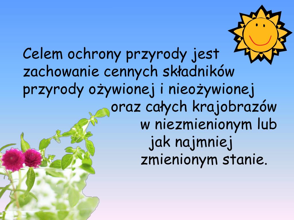 Celem ochrony przyrody jest zachowanie cennych składników przyrody ożywionej i nieożywionej oraz całych krajobrazów w niezmienionym lub jak najmniej zmienionym stanie.