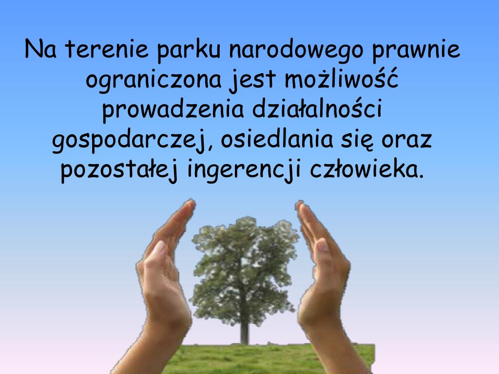 Parki narodowe udostępniane są w celach : • naukowych, • edukacyjnych, • kulturowych, • turystycznych, • sportowych. • Działalność prowadzenia • na terenie parku narodowego • nie może wpływać negatywnie na przyrodę.