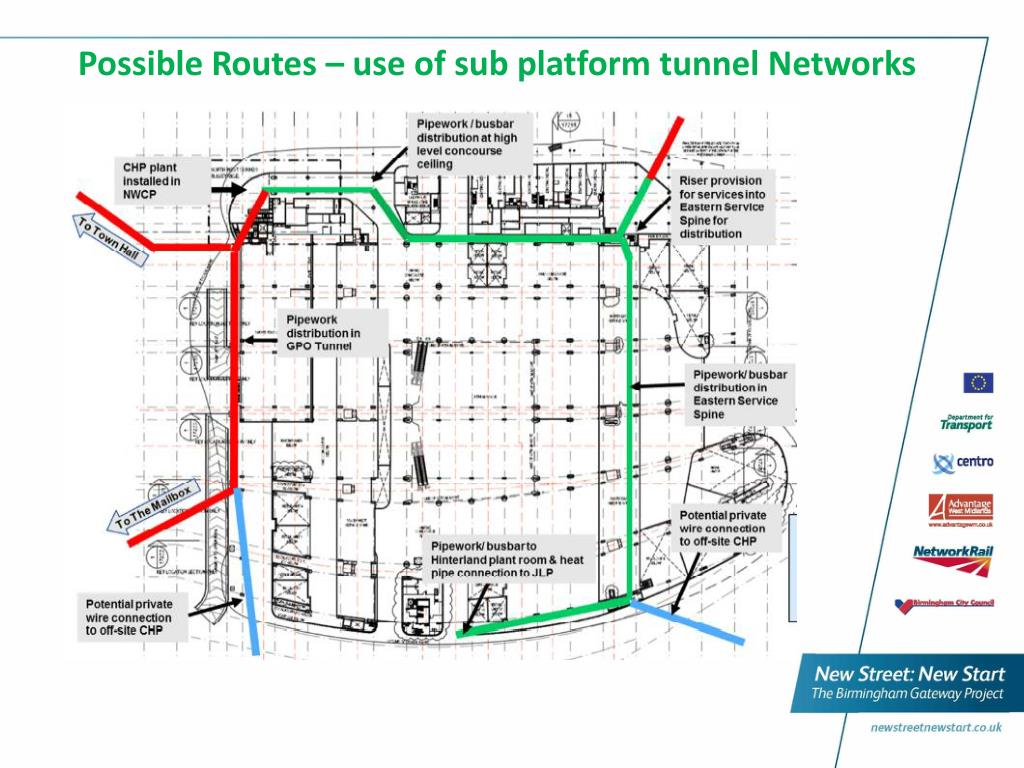 Benefits for CHP at New Street • Significant reduction in Carbon emissions >3,000Ton/yr & supports BCC carbon reduction targets • Provide model case for role out to other managed stations • Reduction in energy bills • Use of strategic tunnel network avoiding disruptive infrastructure works around the city • Potential for significant expansion of the system with heat provision to adjacent buildings • Provision for South side to be ‘CHP ready’ • CRC benefits to Network Rail