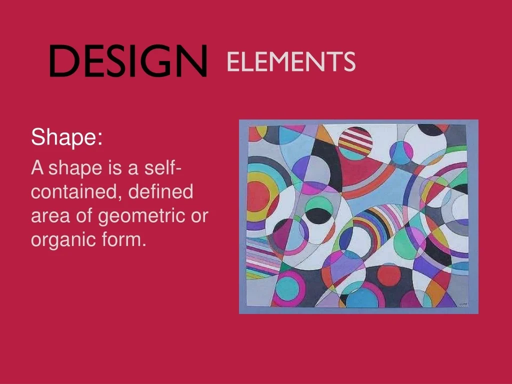 DESIGNELEMENTS Shape: A shape is a self-contained, definedarea of geometricororganicform.
