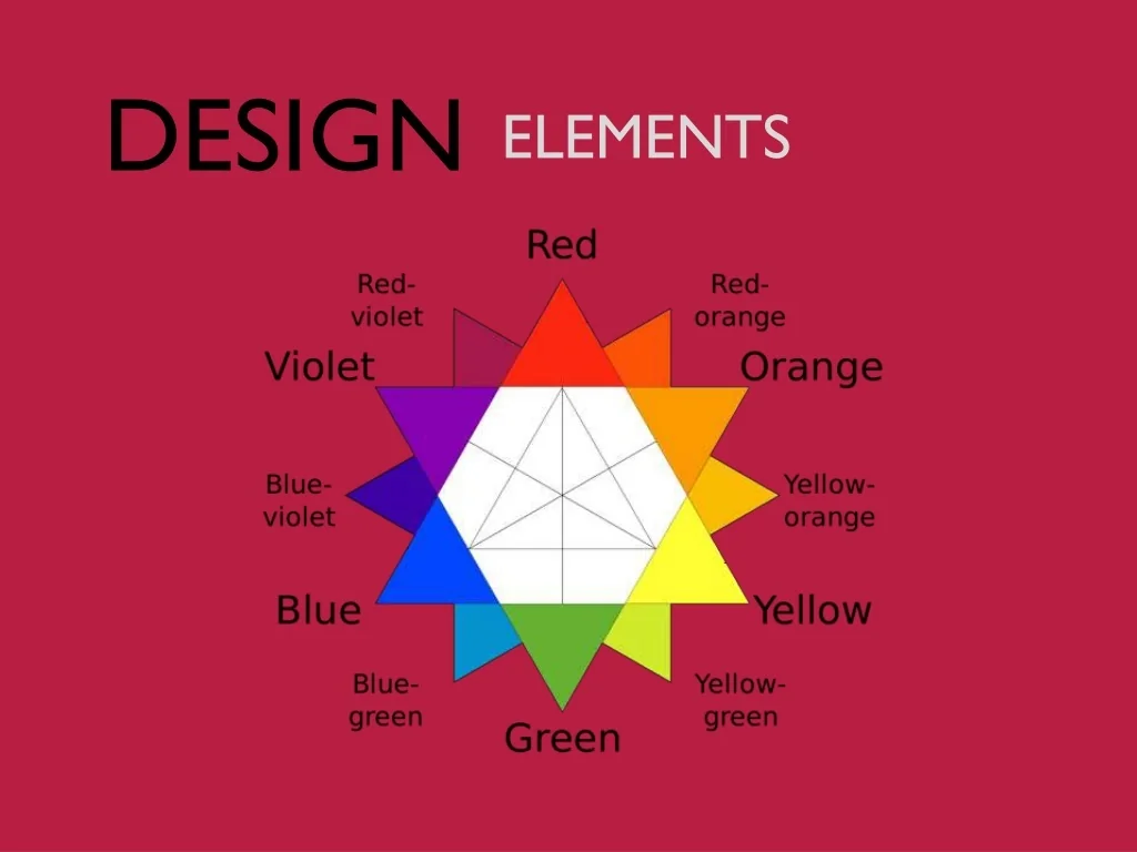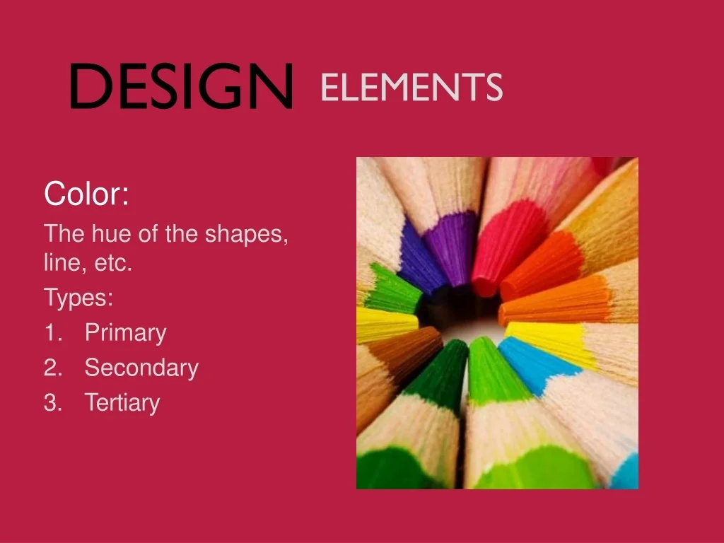 DESIGNELEMENTS Color: The hue of theshapes,line,etc. Types: Primary Secondary Tertiary