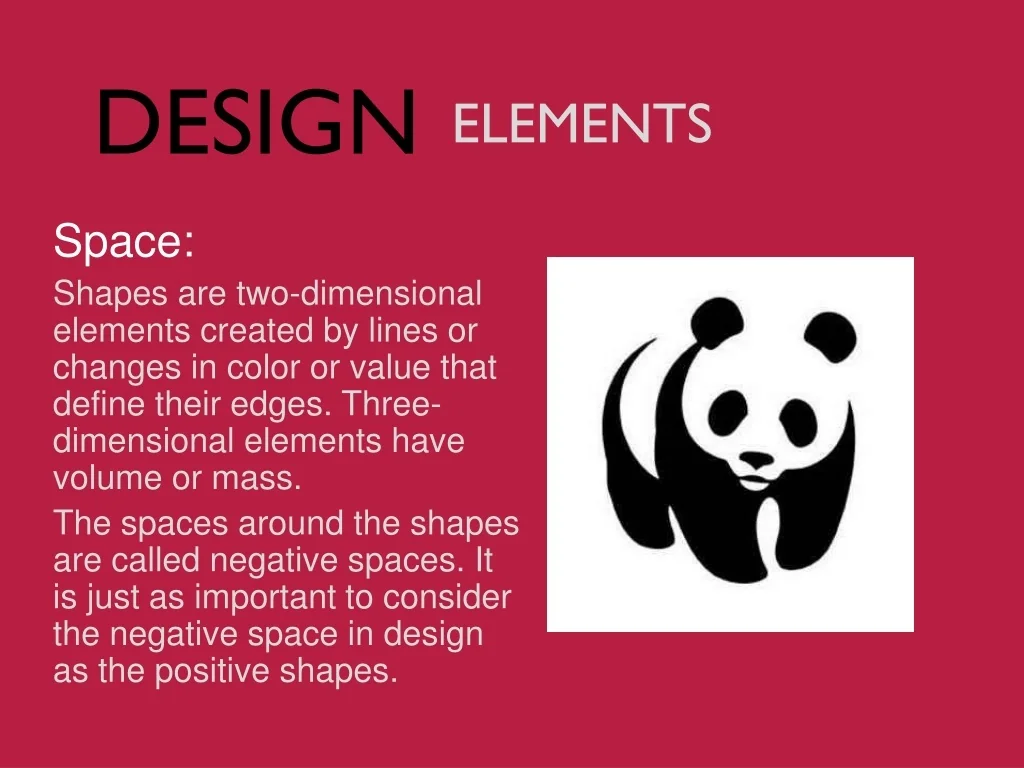 DESIGNELEMENTS Space: Shapes are two-dimensional elements created by lines or changes in color or value that define their edges. Three-dimensional elements have volume or mass. The spaces around the shapes are called negative spaces. It is just as important to consider the negative space in design as the positive shapes.