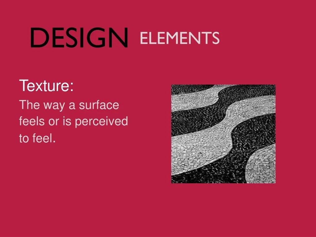 DESIGNELEMENTS Texture: The way a surfacefeelsor is perceived tofeel.