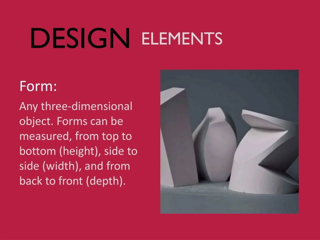 DESIGNELEMENTS Form: Anythree-dimensional object.Formscan be measured,from top to bottom(height), side to side(width), and from back tofront(depth).