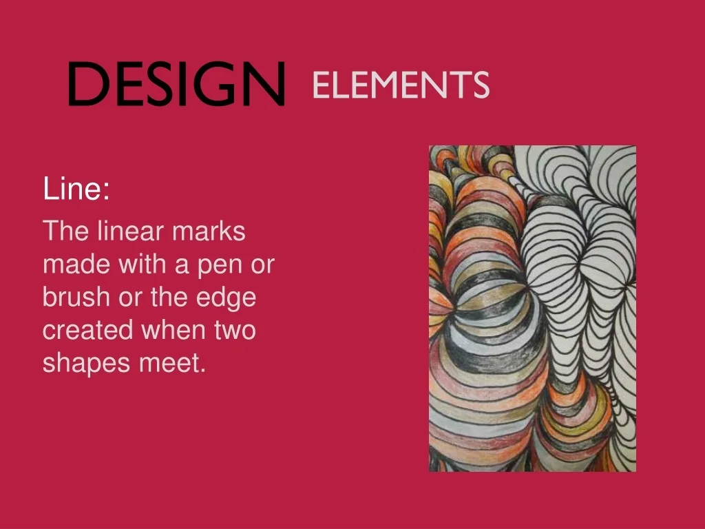 DESIGNELEMENTS Line: The linear marksmade with a penorbrush or the edgecreated when twoshapesmeet.