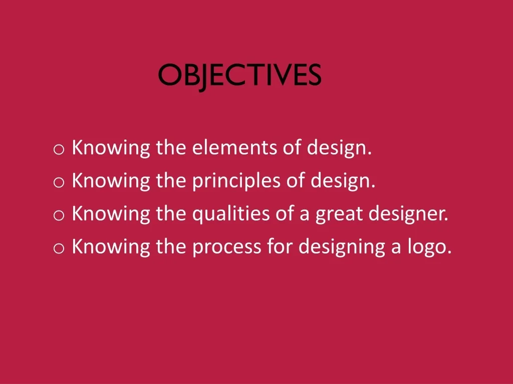 OBJECTIVES • Knowing the elements of design. • Knowing the principles ofdesign. • Knowing the qualities of a great designer. • Knowing the process for designing a logo.