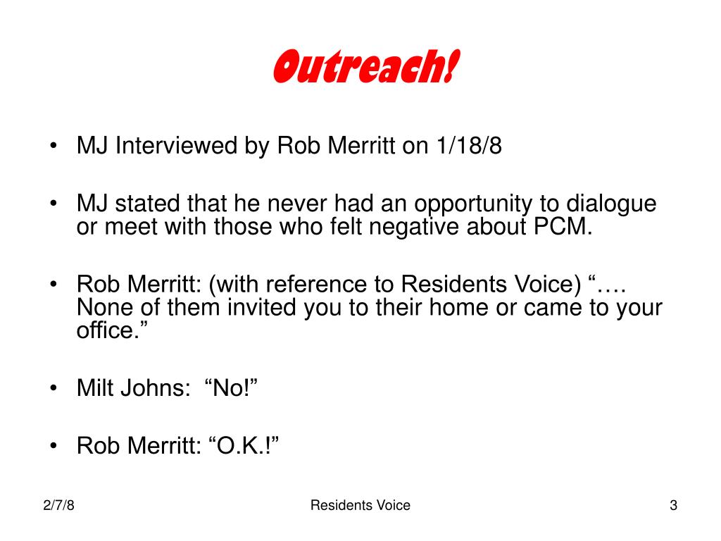 Outreach! • MJ Interviewed by Rob Merritt on 1/18/8 • MJ stated that he never had an opportunity to dialogue or meet with those who felt negative about PCM. • Rob Merritt: (with reference to Residents Voice) “…. None of them invited you to their home or came to your office.” • Milt Johns: “No!” • Rob Merritt: “O.K.!” Residents Voice