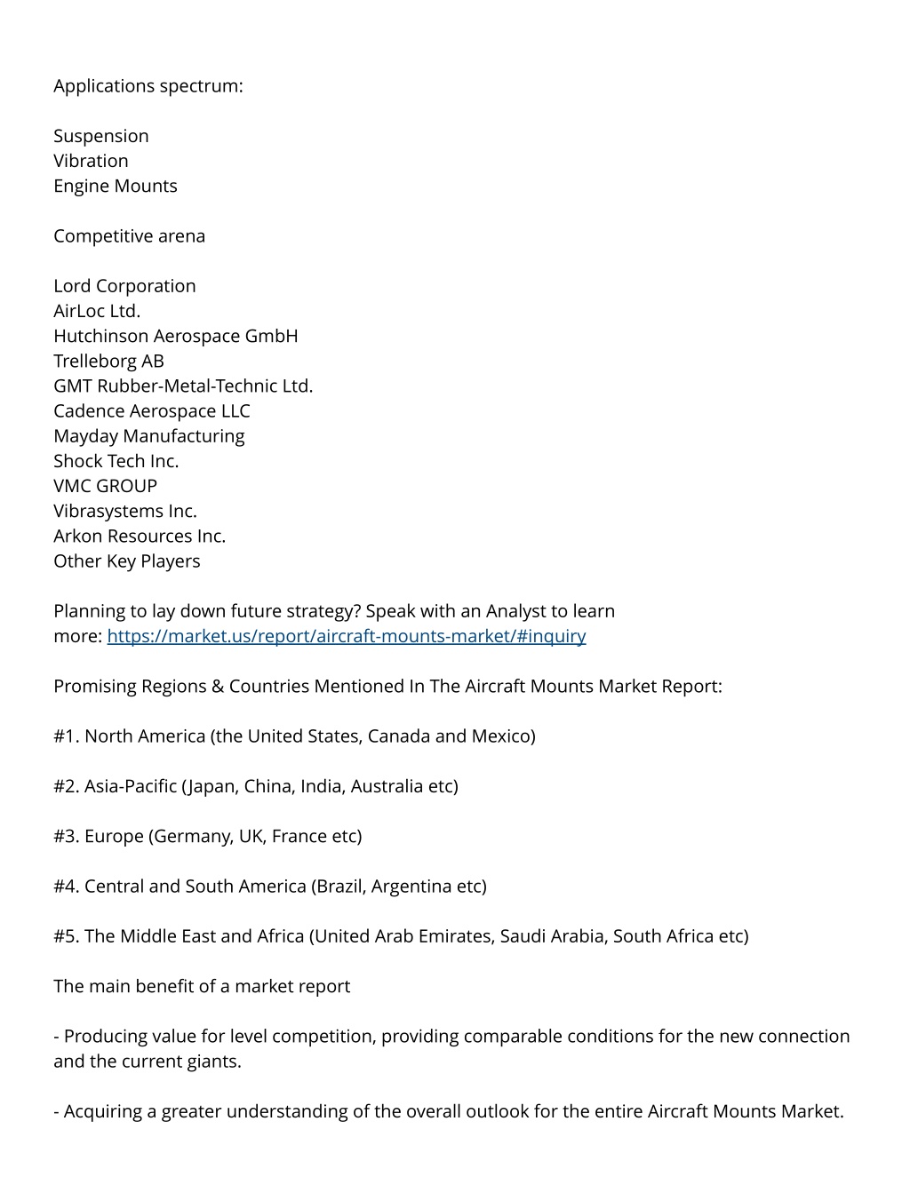 Applications spectrum: Suspension Vibration Engine Mounts Competitive arena Lord Corporation AirLoc Ltd. Hutchinson Aerospace GmbH Trelleborg AB GMT Rubber-Metal-Technic Ltd. Cadence Aerospace LLC Mayday Manufacturing Shock Tech Inc. VMC GROUP Vibrasystems Inc. Arkon Resources Inc. Other Key Players Planning to lay down future strategy? Speak with an Analyst to learn more: https://market.us/report/aircraft-mounts-market/#inquiry Promising Regions & Countries Mentioned In The Aircraft Mounts Market Report: #1. North America (the United States, Canada and Mexico) #2. Asia-Pacific (Japan, China, India, Australia etc) #3. Europe (Germany, UK, France etc) #4. Central and South America (Brazil, Argentina etc) #5. The Middle East and Africa (United Arab Emirates, Saudi Arabia, South Africa etc) The main benefit of a market report - Producing value for level competition, providing comparable conditions for the new connection and the current giants. - Acquiring a greater understanding of the overall outlook for the entire Aircraft Mounts Market.