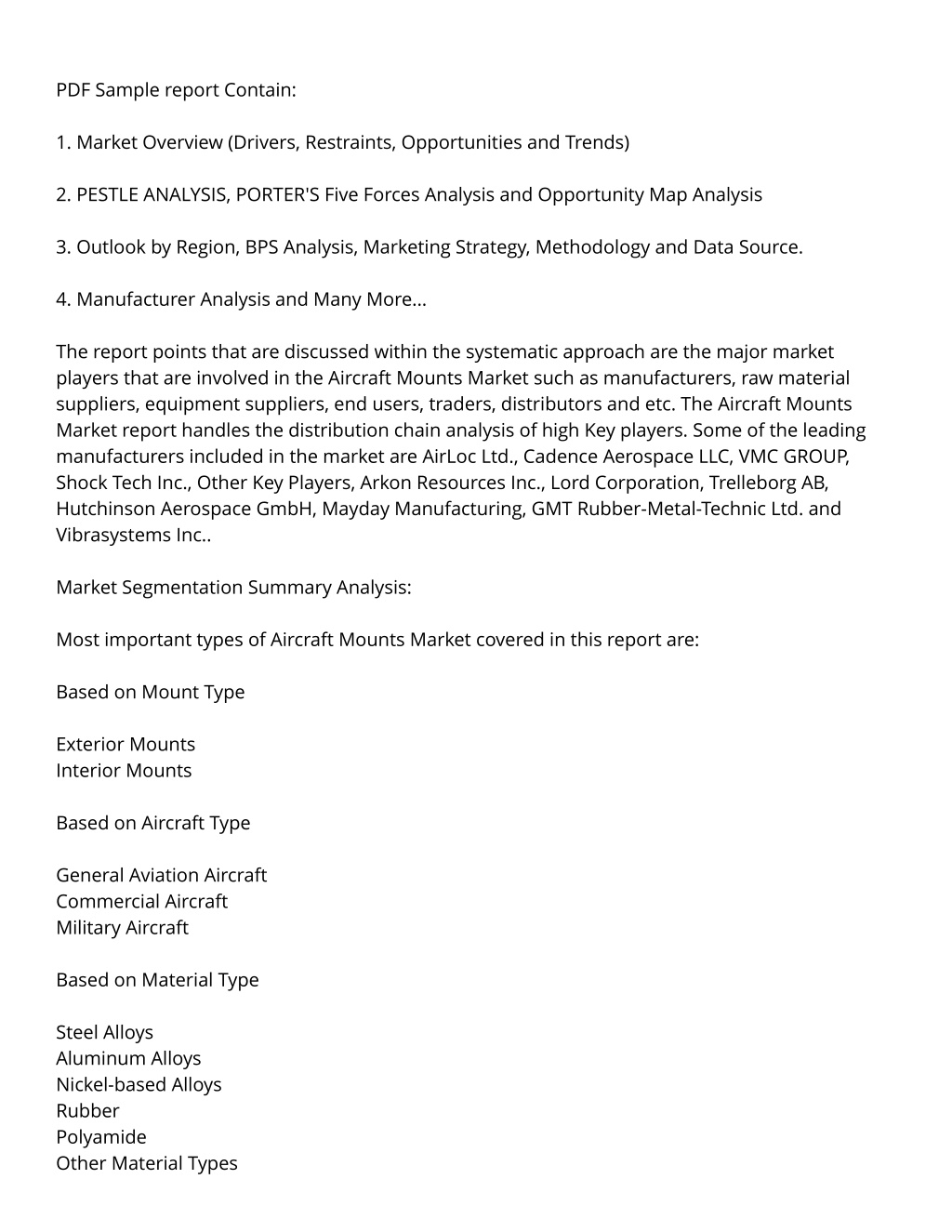 PDF Sample report Contain: 1. Market Overview (Drivers, Restraints, Opportunities and Trends) 2. PESTLE ANALYSIS, PORTER'S Five Forces Analysis and Opportunity Map Analysis 3. Outlook by Region, BPS Analysis, Marketing Strategy, Methodology and Data Source. 4. Manufacturer Analysis and Many More... The report points that are discussed within the systematic approach are the major market players that are involved in the Aircraft Mounts Market such as manufacturers, raw material suppliers, equipment suppliers, end users, traders, distributors and etc. The Aircraft Mounts Market report handles the distribution chain analysis of high Key players. Some of the leading manufacturers included in the market are AirLoc Ltd., Cadence Aerospace LLC, VMC GROUP, Shock Tech Inc., Other Key Players, Arkon Resources Inc., Lord Corporation, Trelleborg AB, Hutchinson Aerospace GmbH, Mayday Manufacturing, GMT Rubber-Metal-Technic Ltd. and Vibrasystems Inc.. Market Segmentation Summary Analysis: Most important types of Aircraft Mounts Market covered in this report are: Based on Mount Type Exterior Mounts Interior Mounts Based on Aircraft Type General Aviation Aircraft Commercial Aircraft Military Aircraft Based on Material Type Steel Alloys Aluminum Alloys Nickel-based Alloys Rubber Polyamide Other Material Types