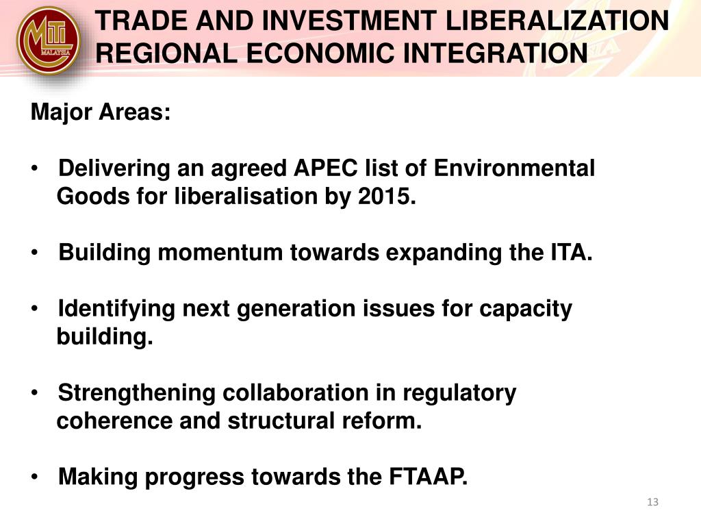 TRADE AND INVESTMENT LIBERALIZATION REGIONAL ECONOMIC INTEGRATION • Major Areas: • Delivering an agreed APEC list of Environmental • Goods for liberalisation by 2015. • Building momentum towards expanding the ITA. • Identifying next generation issues for capacity • building. • Strengthening collaboration in regulatory • coherence and structural reform. • Making progress towards the FTAAP.
