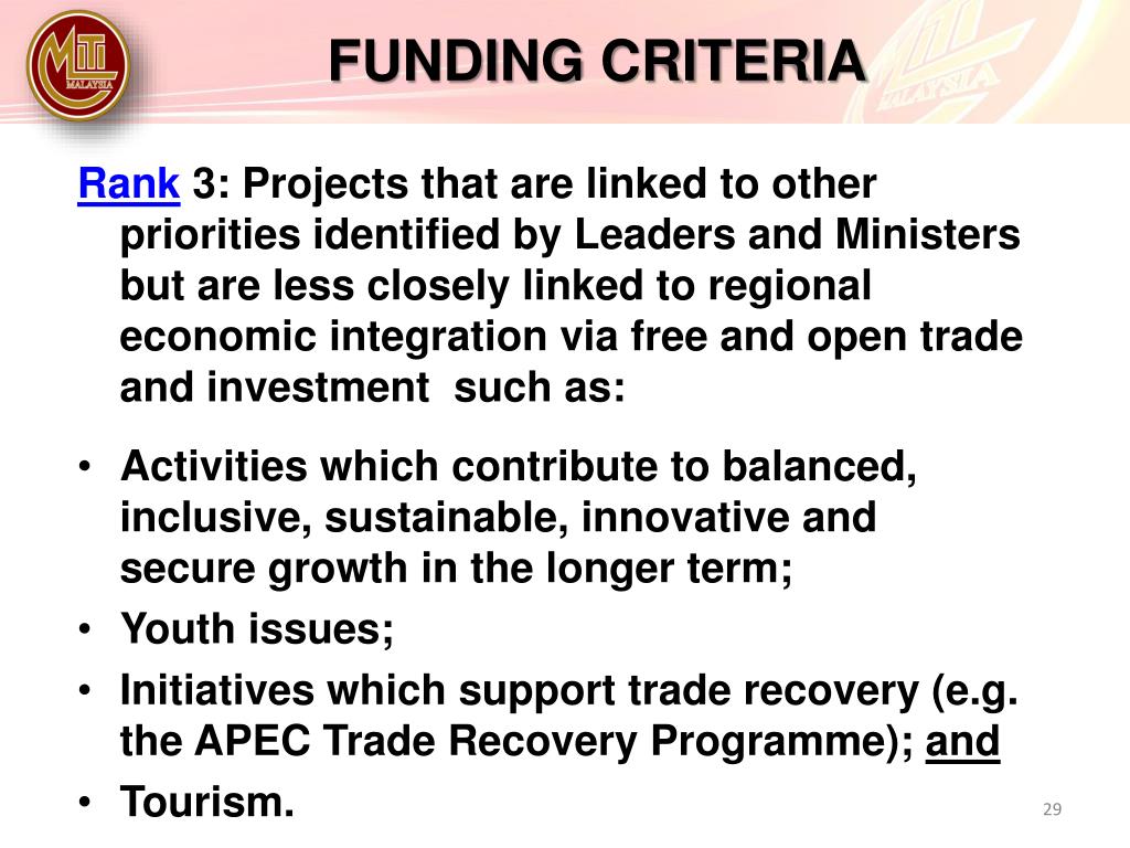 FUNDING CRITERIA Rank 3: Projects that are linked to other priorities identified by Leaders and Ministers but are less closely linked to regional economic integration via free and open trade and investment such as: • Activities which contribute to balanced, inclusive, sustainable, innovative and secure growth in the longer term; • Youth issues; • Initiatives which support trade recovery (e.g. the APEC Trade Recovery Programme); and • Tourism.