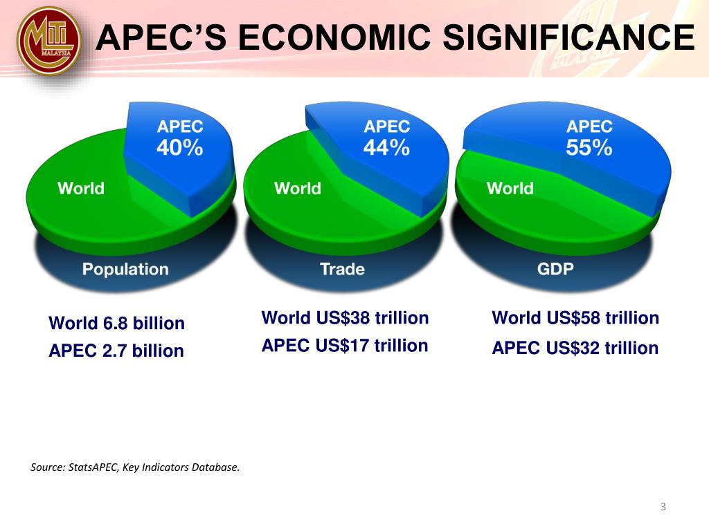 APEC’S ECONOMIC SIGNIFICANCE World US$38 trillion APEC US$17 trillion World US$58 trillion APEC US$32 trillion World6.8billion APEC 2.7 billion Source: StatsAPEC, Key Indicators Database.