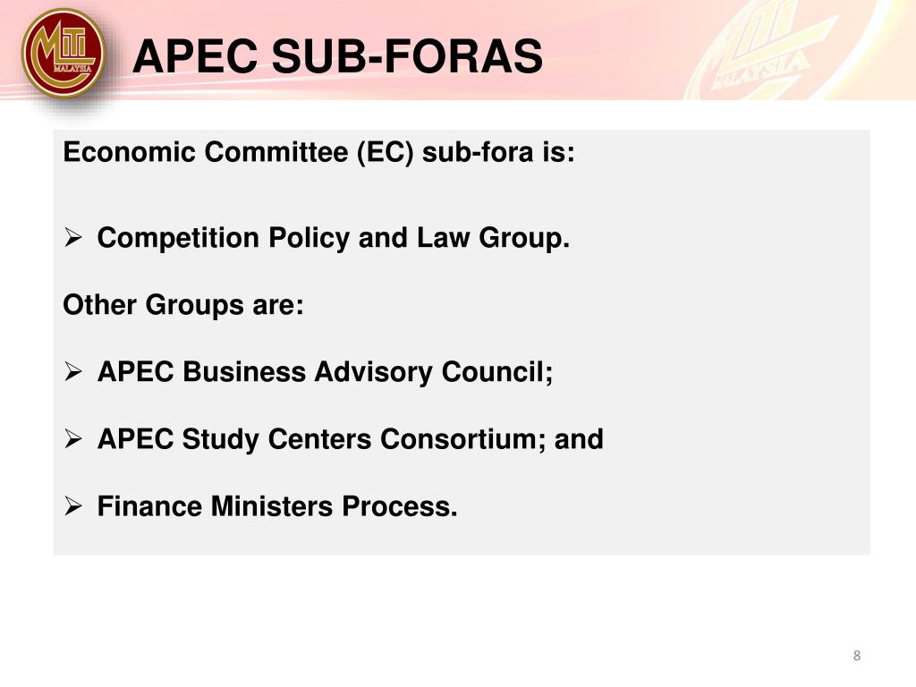 APEC SUB-FORAS • Economic Committee (EC) sub-fora is: • Competition Policy and Law Group. • Other Groups are: • APEC Business Advisory Council; • APEC Study Centers Consortium; and • Finance Ministers Process.