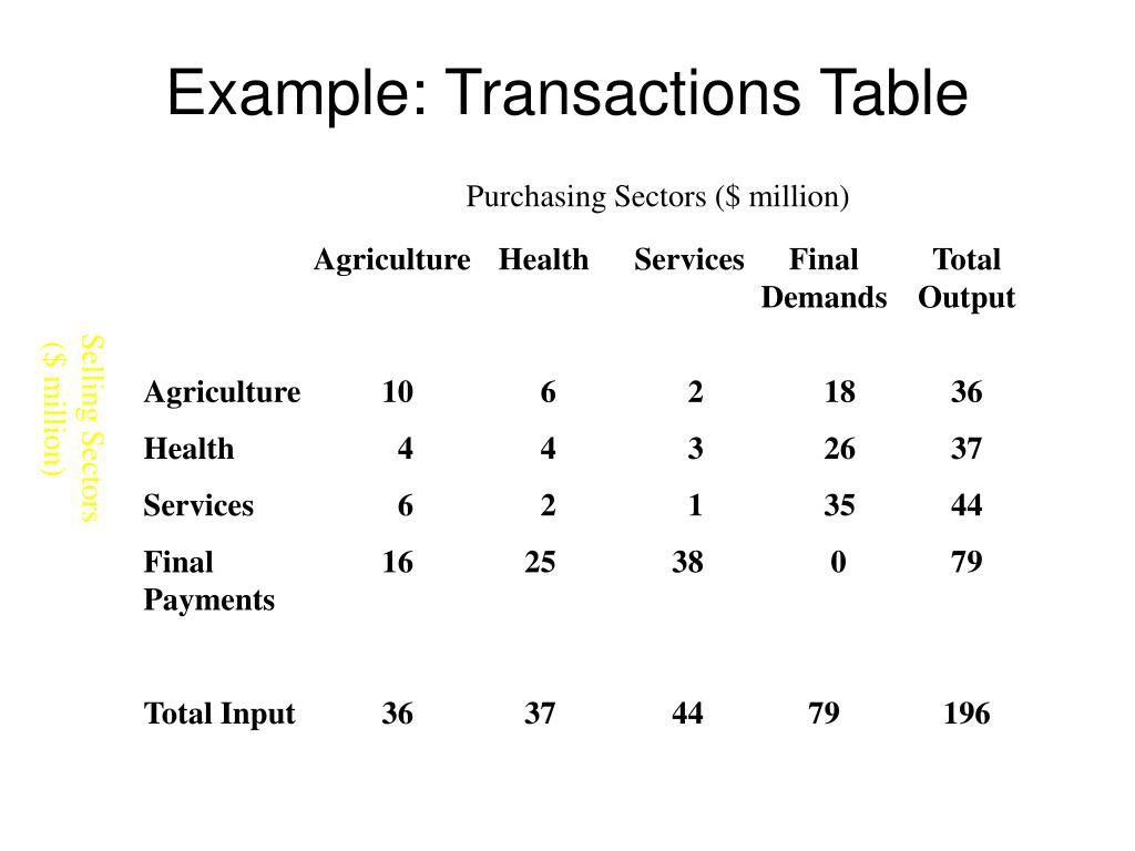 Purchasing Sectors ($ million) Agriculture Health Services Final Total Demands Output Agriculture 10 6 2 18 36 Health 4 4 3 26 37 Services 6 2 1 35 44 Final 16 25 38 0 79 Payments Total Input 36 37 44 79 196 Selling Sectors ($ million) Example: Transactions Table
