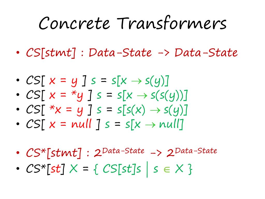 Concrete Transformers • CS[stmt] : Data-State -> Data-State • CS[ x = y ] s = s[x s(y)] • CS[ x = *y ] s = s[x s(s(y))] • CS[ *x = y ] s = s[s(x) s(y)] • CS[ x = null ] s = s[x null] • CS*[stmt] : 2Data-State -> 2Data-State • CS*[st] X = { CS[st]s | s Î X }
