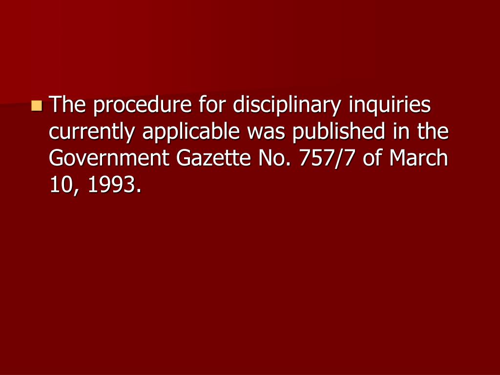 The procedure for disciplinary inquiries currently applicable was published in the Government Gazette No. 757/7 of March 10, 1993.