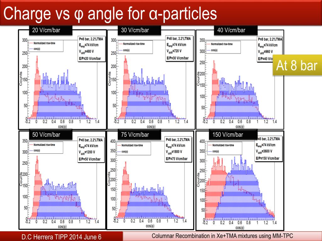 Charge vsφanglefor α-particles Data Analysis-Validation 20 V/cm/bar 30 V/cm/bar 40 V/cm/bar At 8 bar 50 V/cm/bar 75 V/cm/bar 150 V/cm/bar D.C Herrera TIPP 2014 June 6 Columnar Recombination in Xe+TMA mixtures using MM-TPC