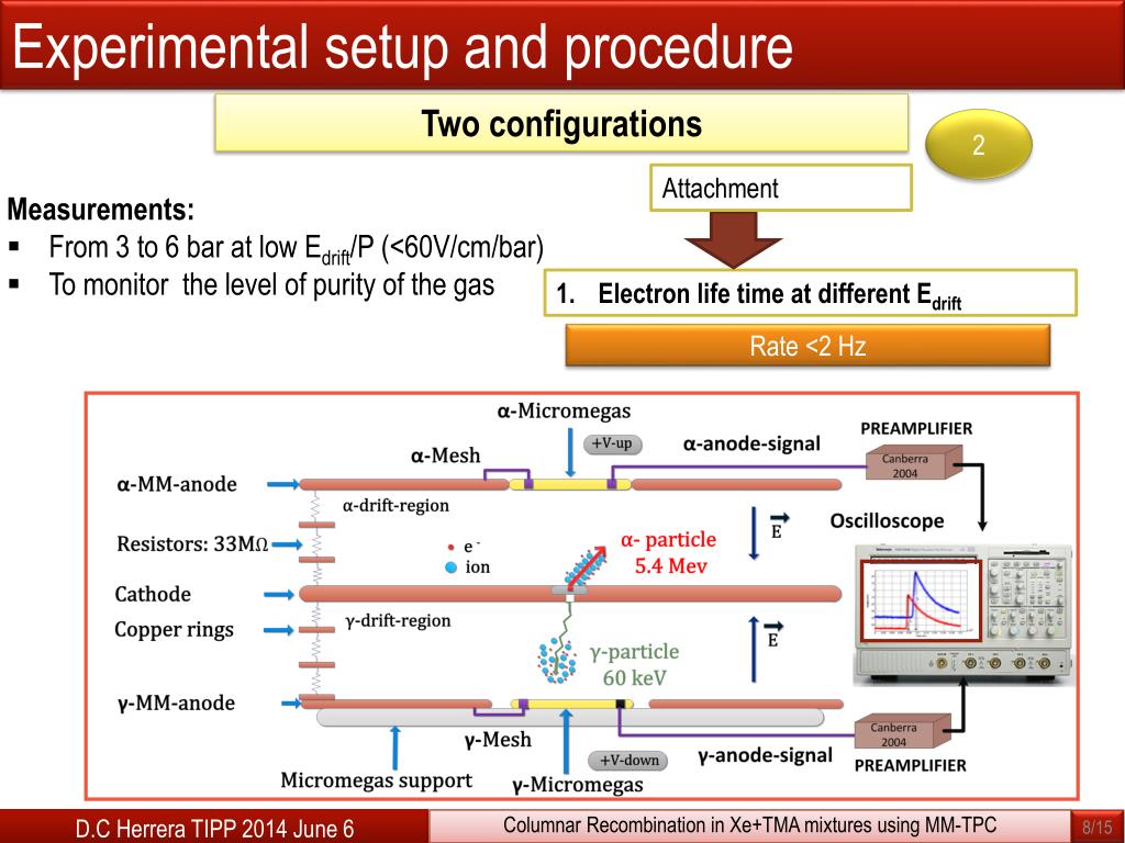 Outline Introduction Experimental setup and procedure Results: Electron life time Results: Recombination 4.1Charge vsEdrift/P for α-particles and γ-rays 4.2 Charge vs φ angle for α-particles Conclusions and Outlook 1 2 3 4 5 D.C Herrera, TIPP 2014 June 6 Columnar Recombination in Xe+TMA mixtures using MM-TPC