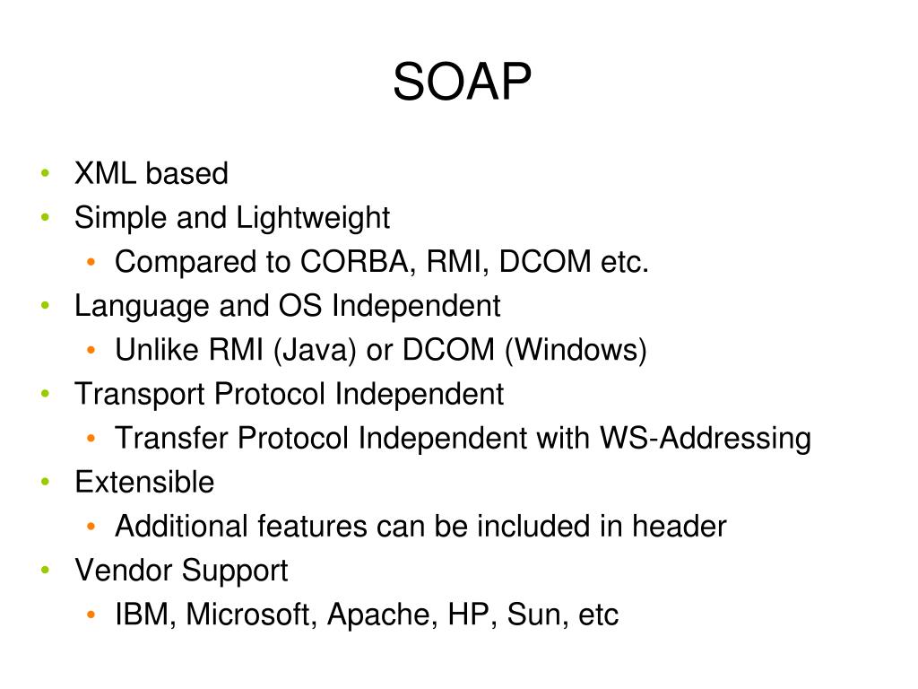SOAP • XML based • Simple and Lightweight • Compared to CORBA, RMI, DCOM etc. • Language and OS Independent • Unlike RMI (Java) or DCOM (Windows) • Transport Protocol Independent • Transfer Protocol Independent with WS-Addressing • Extensible • Additional features can be included in header • Vendor Support • IBM, Microsoft, Apache, HP, Sun, etc