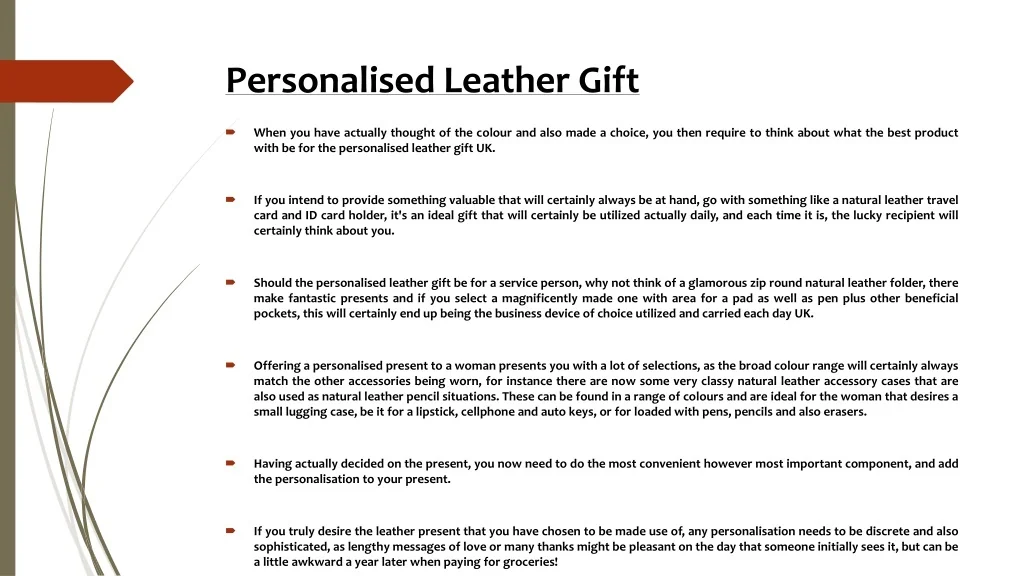 Personalised Leather Gift • When you have actually thought of the colour and also made a choice, you then require to think about what the best product with be for the personalised leather gift UK. • If you intend to provide something valuable that will certainly always be at hand, go with something like a natural leather travel card and ID card holder, it's an ideal gift that will certainly be utilized actually daily, and each time it is, the lucky recipient will certainly think about you. • Should the personalised leather gift be for a service person, why not think of a glamorous zip round natural leather folder, there make fantastic presents and if you select a magnificently made one with area for a pad as well as pen plus other beneficial pockets, this will certainly end up being the business device of choice utilized and carried each day UK. • Offering a personalised present to a woman presents you with a lot of selections, as the broad colour range will certainly always match the other accessories being worn, for instance there are now some very classy natural leather accessory cases that are also used as natural leather pencil situations. These can be found in a range of colours and are ideal for the woman that desires a small lugging case, be it for a lipstick, cellphone and auto keys, or for loaded with pens, pencils and also erasers. • Having actually decided on the present, you now need to do the most convenient however most important component, and add the personalisation to your present. • If you truly desire the leather present that you have chosen to be made use of, any personalisation needs to be discrete and also sophisticated, as lengthy messages of love or many thanks might be pleasant on the day that someone initially sees it, but can be a little awkward a year later when paying for groceries!