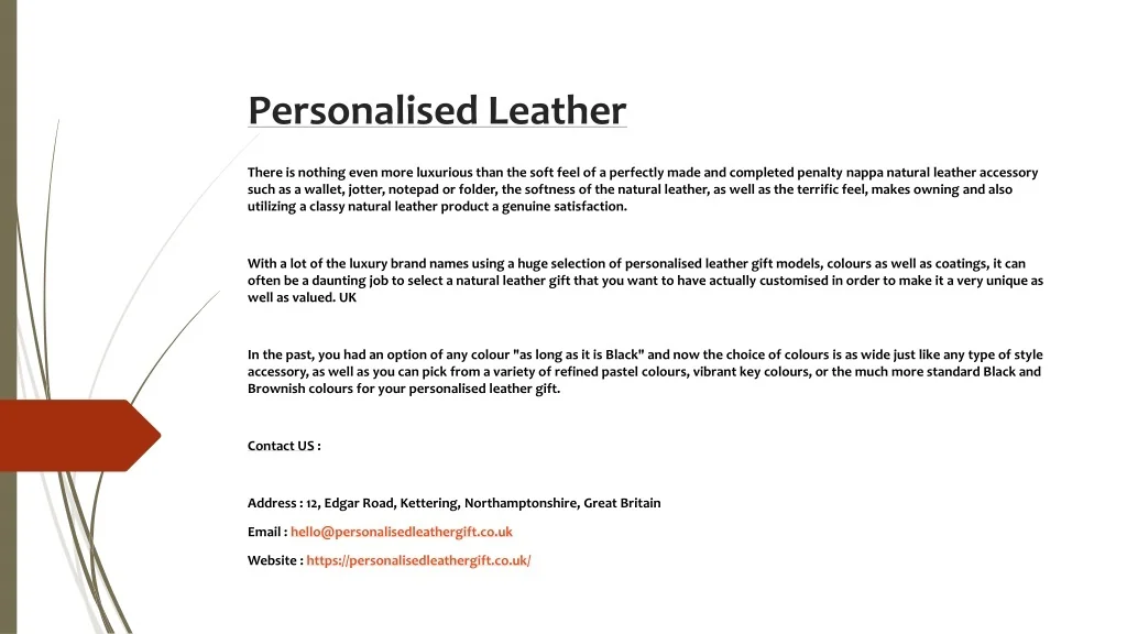 Personalised Leather There is nothing even more luxurious than the soft feel of a perfectly made and completed penalty nappa natural leather accessory such as a wallet, jotter, notepad or folder, the softness of the natural leather, as well as the terrific feel, makes owning and also utilizing a classy natural leather product a genuine satisfaction. With a lot of the luxury brand names using a huge selection of personalised leather gift models, colours as well as coatings, it can often be a daunting job to select a natural leather gift that you want to have actually customised in order to make it a very unique as well as valued. UK In the past, you had an option of any colour "as long as it is Black" and now the choice of colours is as wide just like any type of style accessory, as well as you can pick from a variety of refined pastel colours, vibrant key colours, or the much more standard Black and Brownish colours for your personalised leather gift. Contact US : Address : 12, Edgar Road, Kettering, Northamptonshire, Great Britain Email : hello@personalisedleathergift.co.uk Website : https://personalisedleathergift.co.uk/