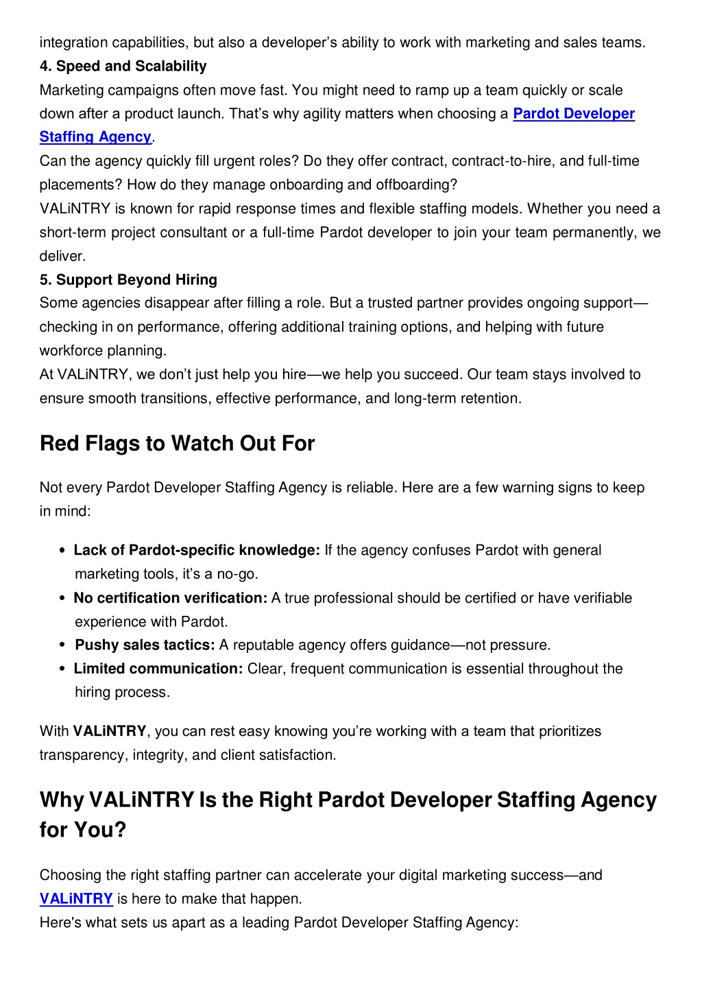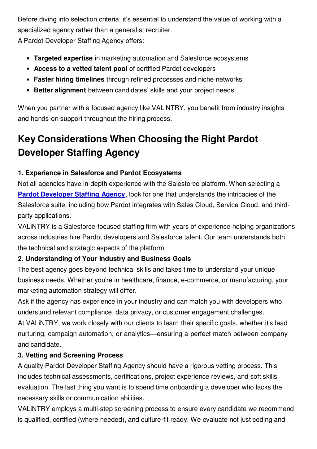 integration capabilities, but also a developer’s ability to work with marketing and sales teams. 4. Speed and Scalability Marketing campaigns often move fast. You might need to ramp up a team quickly or scale down after a product launch. That’s why agility matters when choosing a Pardot Developer Staffing Agency. Can the agency quickly fill urgent roles? Do they offer contract, contract-to-hire, and full-time placements? How do they manage onboarding and offboarding? VALiNTRY is known for rapid response times and flexible staffing models. Whether you need a short-term project consultant or a full-time Pardot developer to join your team permanently, we deliver. 5. Support Beyond Hiring Some agencies disappear after filling a role. But a trusted partner provides ongoing support— checking in on performance, offering additional training options, and helping with future workforce planning. At VALiNTRY, we don’t just help you hire—we help you succeed. Our team stays involved to ensure smooth transitions, effective performance, and long-term retention. Red Flags to Watch Out For Not every Pardot Developer Staffing Agency is reliable. Here are a few warning signs to keep in mind: Lack of Pardot-specific knowledge: If the agency confuses Pardot with general marketing tools, it’s a no-go. No certification verification: A true professional should be certified or have verifiable experience with Pardot. Pushy sales tactics: A reputable agency offers guidance—not pressure. Limited communication: Clear, frequent communication is essential throughout the hiring process. With VALiNTRY, you can rest easy knowing you’re working with a team that prioritizes transparency, integrity, and client satisfaction. Why VALiNTRY Is the Right Pardot Developer Staffing Agency for You? Choosing the right staffing partner can accelerate your digital marketing success—and VALiNTRY is here to make that happen. Here's what sets us apart as a leading Pardot Developer Staffing Agency: