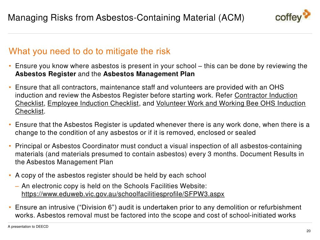 Managing Risks from Asbestos-Containing Material (ACM) What you need to do to mitigate the risk • Ensure you know where asbestos is present in your school – this can be done by reviewing the Asbestos Register and the Asbestos Management Plan • Ensure that all contractors, maintenance staff and volunteers are provided with an OHSinduction and review the Asbestos Register before starting work. Refer Contractor Induction Checklist, Employee Induction Checklist, and Volunteer Work and Working Bee OHS Induction Checklist. • Ensure that the Asbestos Register is updated whenever there is any work done, when there is a change to the condition of any asbestos or if it is removed, enclosed or sealed • Principal or Asbestos Coordinator must conduct a visual inspection of all asbestos-containing materials (and materials presumed to contain asbestos) every 3 months. Document Results in the Asbestos Management Plan • A copy of the asbestos register should be held by each school • An electronic copy is held on the Schools Facilities Website: https://www.eduweb.vic.gov.au/schoolfacilitiesprofile/SFPW3.aspx • Ensure an intrusive (“Division 6”) audit is undertaken prior to any demolition or refurbishment works. Asbestos removal must be factored into the scope and cost of school-initiated works A presentation to DEECD